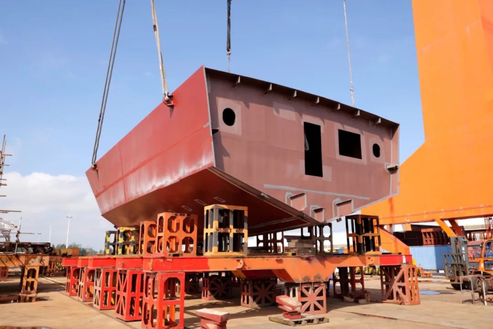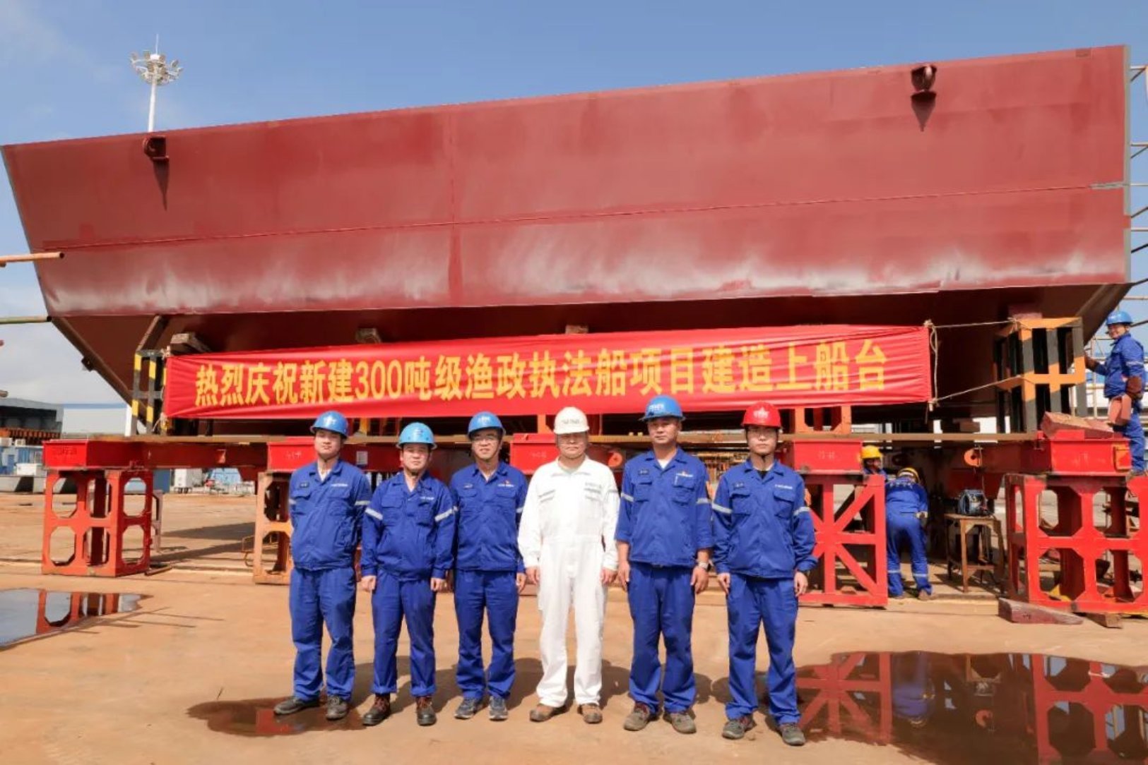 10月8日,由武昌造船為連云港市海洋與漁業(yè)綜合行政執(zhí)法支隊打造的新建300噸級漁政執(zhí)法船,在監(jiān)理、項目三總師及參建單位相關(guān)負責人的見證下,順利上船臺,標志該船正式進入船臺搭載階段。