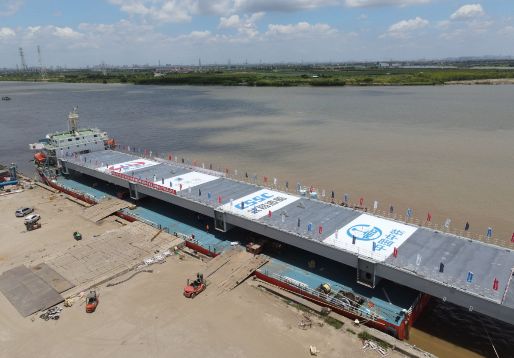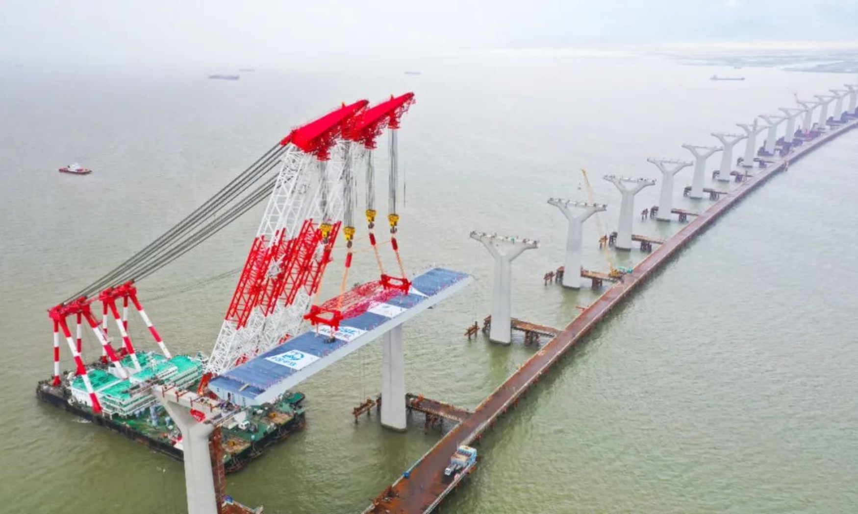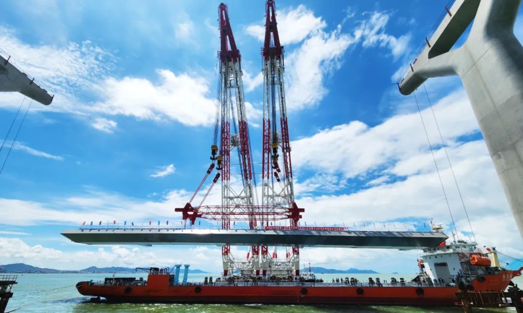 中國船舶集團武昌造船重工公司承接的黃茅海跨海通道G2合同段中引橋為為1600米鋼箱連續(xù)梁橋,左右幅分離,鋼箱梁大節(jié)段共32節(jié),現(xiàn)場采用半幅大節(jié)段吊裝方式進行吊裝。本次吊裝的大節(jié)段長123米、寬18.75米、高4米、重1340噸,是全橋最大、最長、最重的6節(jié)大節(jié)段之一。