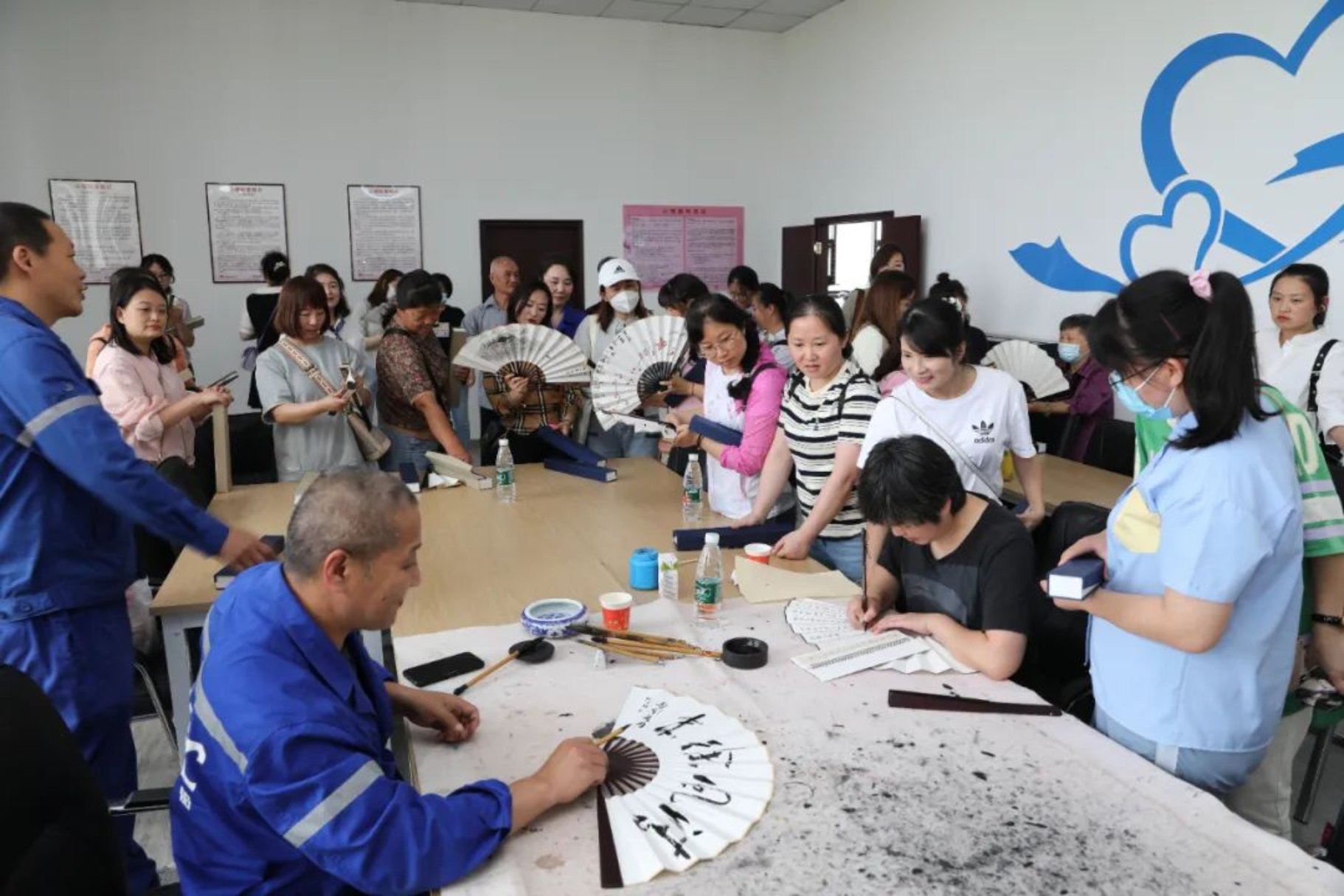 職工家屬參觀職工活動(dòng)中心,武昌造船書法協(xié)會(huì)會(huì)員現(xiàn)場(chǎng)創(chuàng)作字畫折扇并贈(zèng)送職工家屬
