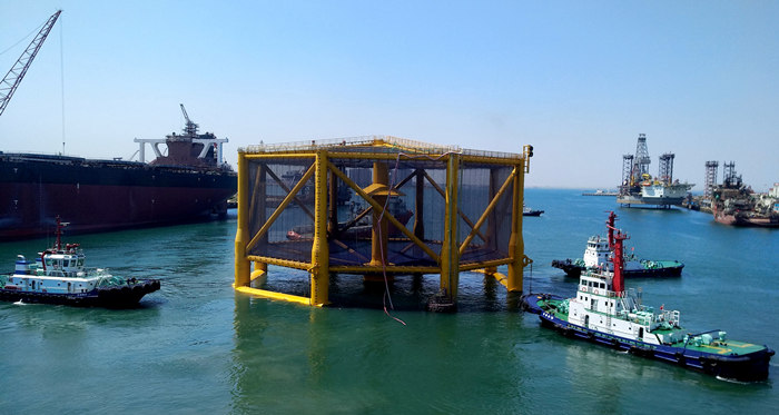 負(fù)責(zé)拖帶的“中交海工001” 輪首先將拖纜系在漁場(chǎng)立柱上的導(dǎo)纜器上,其他輔助的拖船則將纜繩繞在漁場(chǎng)的立柱上,隨著岸邊最后一根纜繩松開(kāi),拖船先將漁場(chǎng)拖離岸邊,然后調(diào)整方向一起向外海駛?cè)ァ?