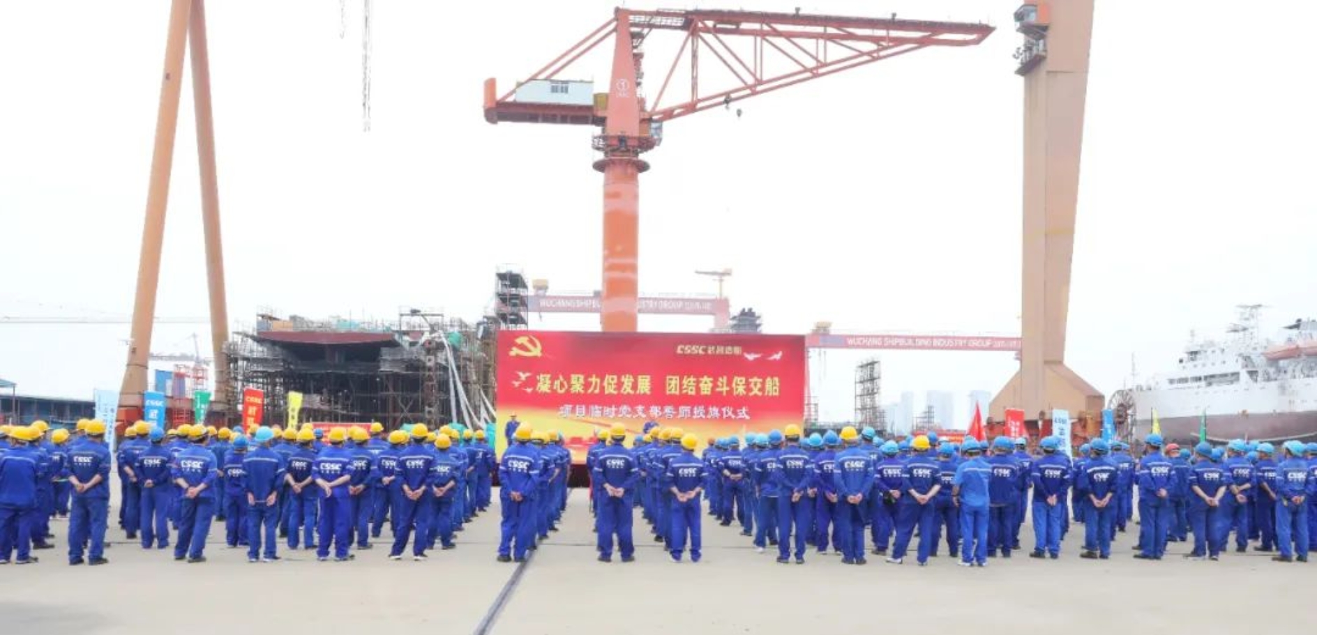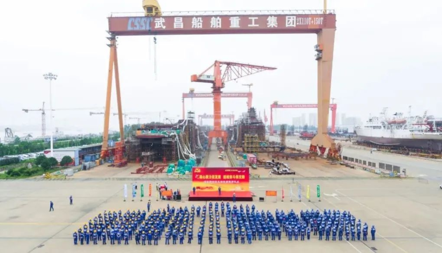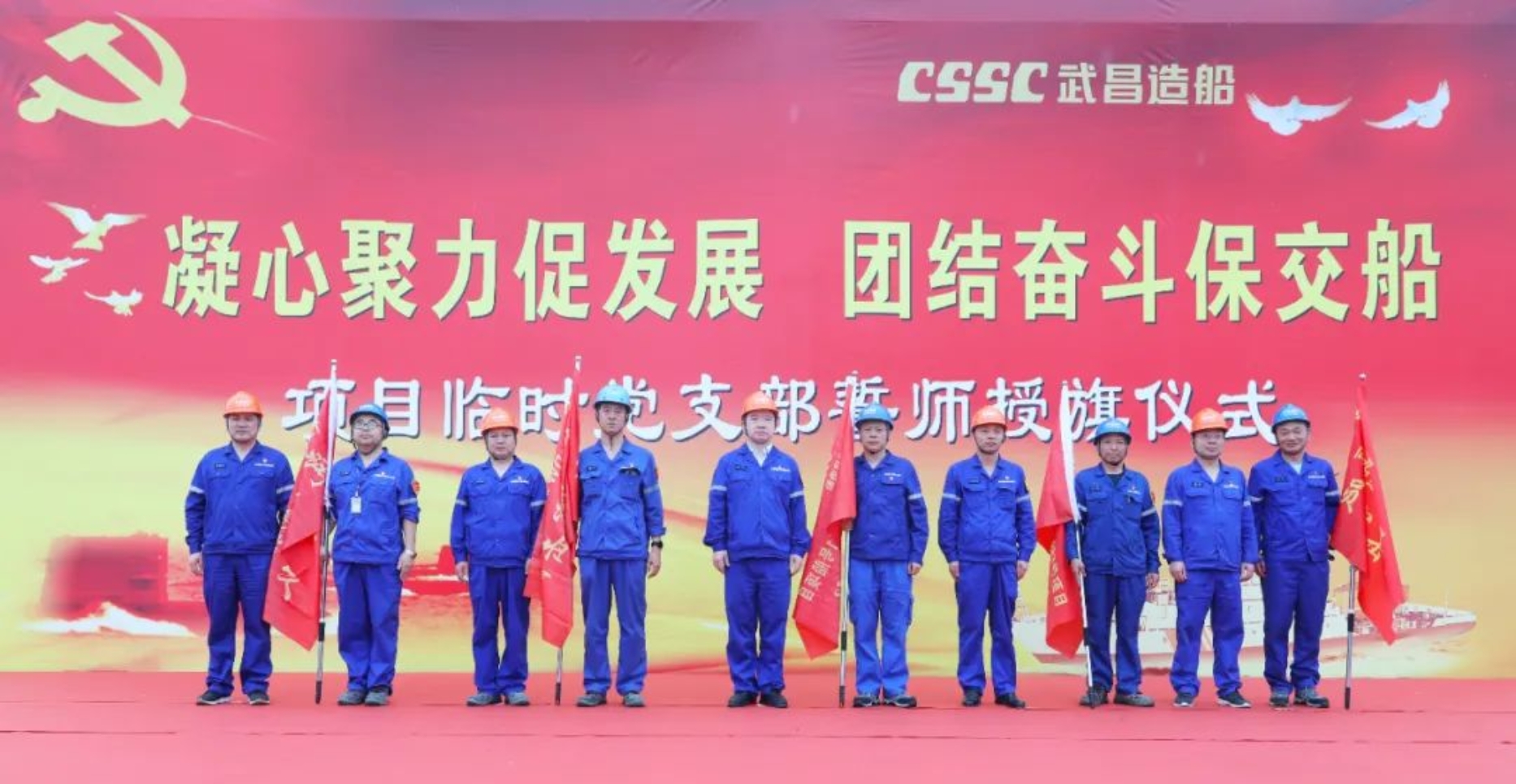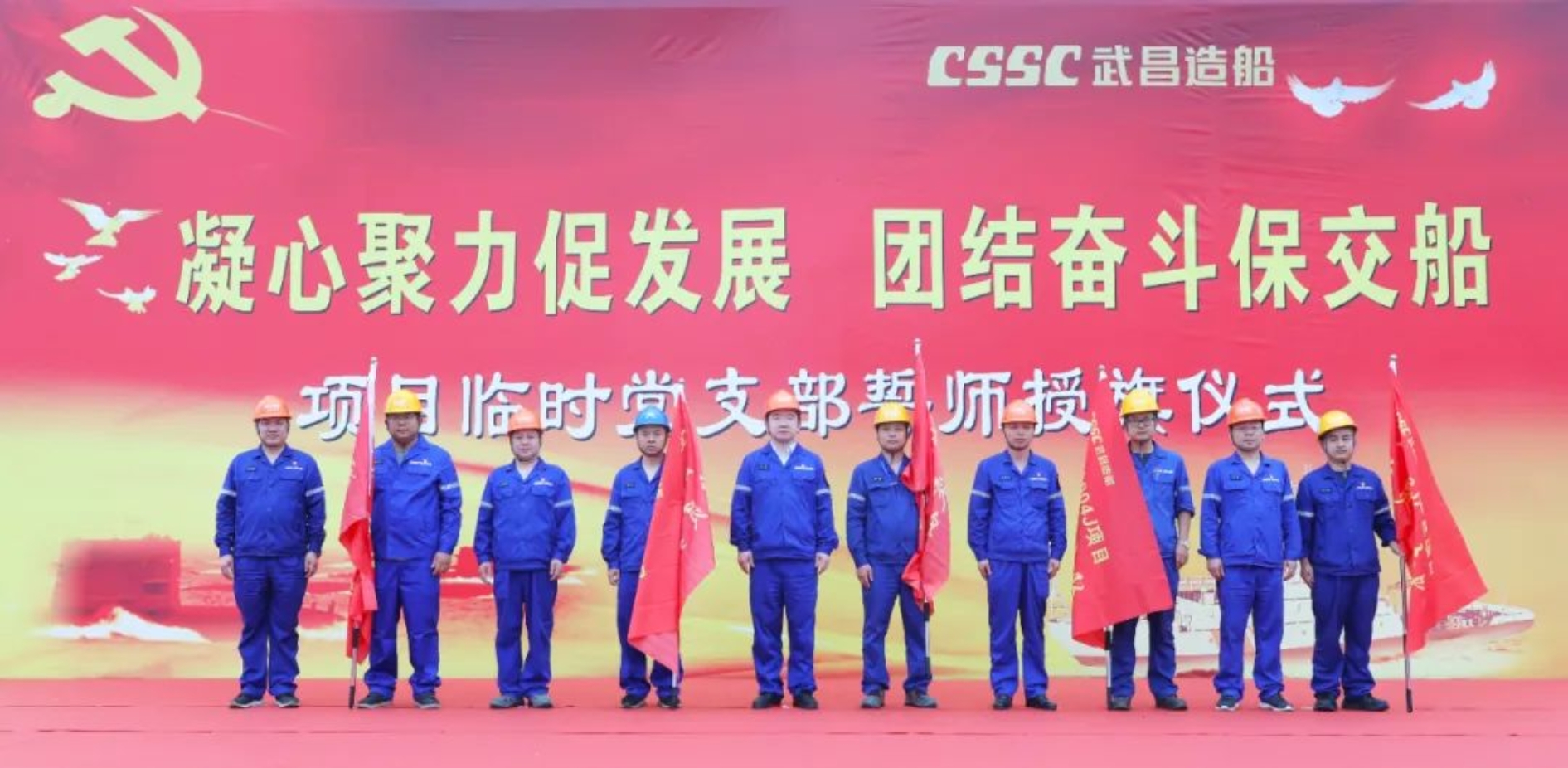 為加快公司高質(zhì)量發(fā)展,以大項(xiàng)目黨建為載體,全力保障重點(diǎn)產(chǎn)品節(jié)點(diǎn)任務(wù)實(shí)現(xiàn),以錨定目標(biāo)真抓實(shí)干推動學(xué)習(xí)貫徹習(xí)近平新時代中國特色社會主義思想主題教育走深走實(shí),2023年6月16日早上7點(diǎn)45分,中國船舶集團(tuán)武昌造船以“凝心聚力促發(fā)展 團(tuán)結(jié)奮斗保交船”為題舉行項(xiàng)目臨時黨支部誓師授旗儀式。公司領(lǐng)導(dǎo)姜濤、梁師清、田軍、唐瀅、陳仲明參加儀式并向10個項(xiàng)目臨時黨支部授旗。公司10個重點(diǎn)項(xiàng)目臨時黨支部成員、參建黨員、職工,軍工部、生產(chǎn)管理部、設(shè)計院等18家單位中層管理人員參加儀式。