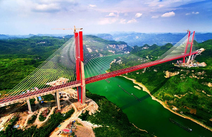 鴨池河特大橋是目前國(guó)內(nèi)第一大跨徑鋼桁架斜拉橋,也是貴黔高速公路的一座特大橋。大橋全長(zhǎng)1461米,主跨為800米,屬雙塔雙索面鋼桁架斜拉橋,主塔采用H型索塔。大橋地處烏蒙山區(qū),雨、雪、霧等惡劣天氣年平均天數(shù)達(dá)到208天,嚴(yán)重影響生產(chǎn)效率的提高,其次橋址處于深切峽谷中,瞬時(shí)風(fēng)力可達(dá)11級(jí),且場(chǎng)地極為狹窄,給鋼桁梁拼裝等施工組織帶來極大的挑戰(zhàn),另外鋼桁梁采用大節(jié)段、長(zhǎng)懸臂拼裝,軸線偏差精度標(biāo)高控制要在10毫米以內(nèi),施工控制難度大。