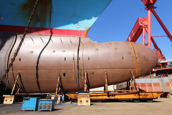 “臺車法”更換球鼻艏和推進器為世界首創(chuàng),大大降低工期和成本,提高了質量和效率。
