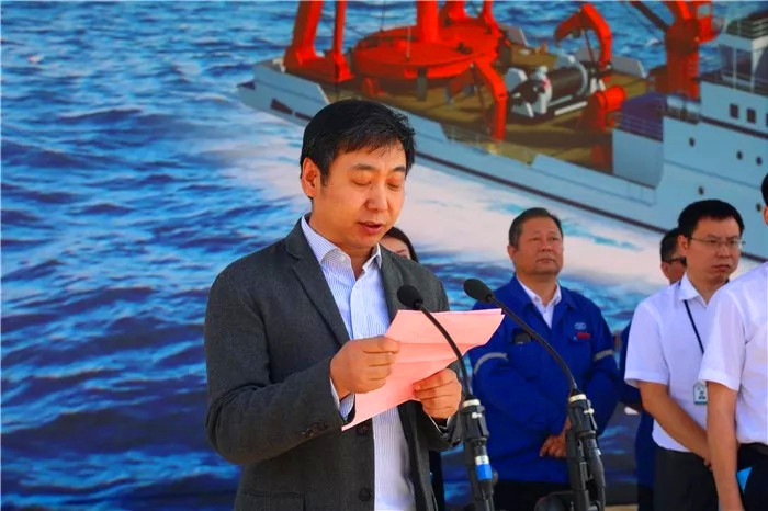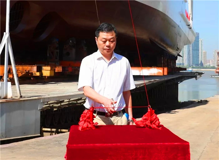 國家自然資源部海洋預(yù)警監(jiān)測司觀測處處長陳陟、國家海洋局東海分局副局長唐文勝、國家海洋局南海分局副局長謝健、國家海洋局北海分局副局長孫利佳、中國船級(jí)社武漢分社副總經(jīng)理余德斌、上海佳船工程監(jiān)理發(fā)展有限公司副總經(jīng)理王道順、中船重工第701研究所所長助理?xiàng)铉?、武船集團(tuán)副總經(jīng)理王渭齡為下水剪彩。唐文勝行擲瓶禮。