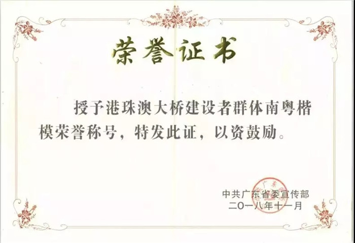 11月3日,廣東省委宣傳部授予港珠澳大橋建設(shè)者群體 “南粵楷?!狈Q號。廣東省委常委、宣傳部部長傅華出席活動,并會見了港珠澳大橋建設(shè)者代表。