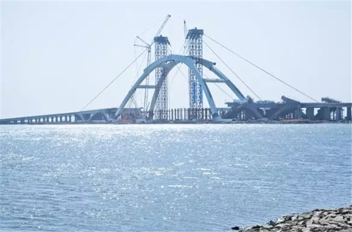 盤(pán)錦橋中橋和東橋合同總噸位1.24萬(wàn)噸,其中中橋位于沿海內(nèi)湖,整個(gè)項(xiàng)目施工區(qū)域均在回填的軟基土上進(jìn)行,施工難度巨大,該橋全長(zhǎng)2310m,主橋鋼拱肋結(jié)構(gòu)形式復(fù)雜,拱肋矢高69m,跨徑200m,拱徑重約4000余噸。