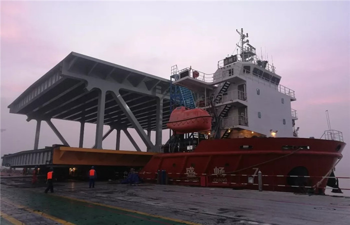 斜船架經(jīng)過45分鐘的下行,滑行到達(dá)指定水域,等待的運輸船舶盛暢7#迅速起錨靠近斜船架,固定纜繩、對準(zhǔn)搭接通道、左舷壓水,項目部、起重運輸部和雙柳公司等20余人的發(fā)運團(tuán)隊各就各位,各司其職,一系列的準(zhǔn)備工作嫻熟而利落。隨后操作人員啟動模塊車,在指揮人員的指令中,緩緩上船。3排軸線上船后,船右舷傾斜下沉,對講機中不斷傳來操作指令:斜船架1檔下行、停止、左舷繼續(xù)壓水、模塊車低速前進(jìn)……,模塊車前輪越過中線后,船體逐漸向左舷復(fù)位傾斜,對講機中操作指令又不斷清晰傳來:斜船架上拉、左舷壓水停止、模塊車?yán)^續(xù)前進(jìn)……。