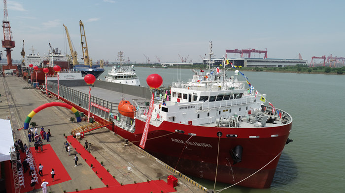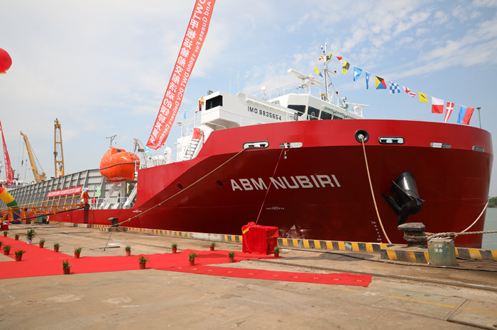 交付儀式現(xiàn)場,武船集團副總經(jīng)理田軍、三泰集團總裁金星闊、路易達孚集團總經(jīng)理杜?艾瑪紐、PT ABM公司總經(jīng)理拉姆?馬修、三星物產(chǎn)公司副總裁李秉順先后致辭。三泰集團總裁夫人金海鷗女士隨后為船只命名。