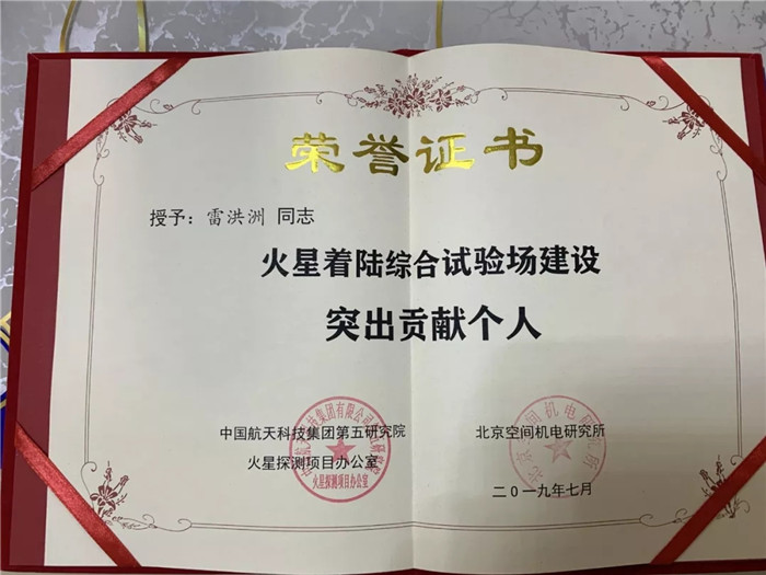▲武船集團(tuán)重裝公司火星著陸綜合試驗(yàn)場建設(shè)施工項(xiàng)目總指揮雷洪洲榮獲“火星著陸綜合試驗(yàn)場建設(shè)突出貢獻(xiàn)個(gè)人”