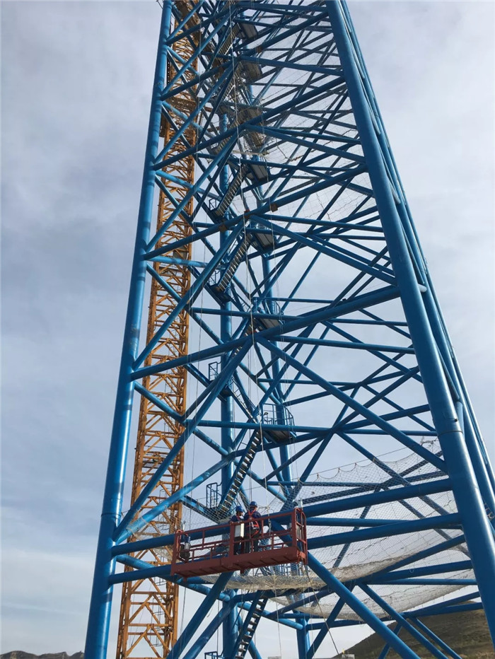 最驚險(xiǎn)的,是在試驗(yàn)過程中,離地84m的一個(gè)導(dǎo)向輪,因高空風(fēng)力過大,導(dǎo)致結(jié)構(gòu)受力不均,便隨著鋼絲脫槽而出,項(xiàng)目臨時(shí)黨支部的小伙不得不連夜進(jìn)行“高空鋼管行走”安裝作業(yè),以確保第二天試驗(yàn)的正常進(jìn)行。