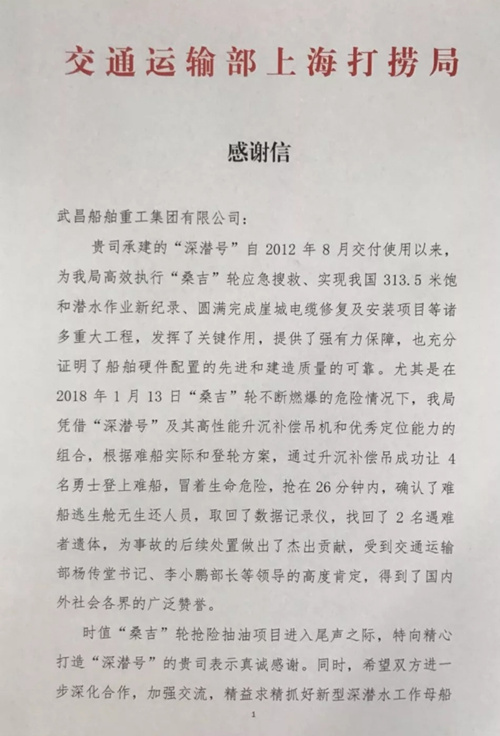 由武船集團(tuán)為交通部上海打撈局建造的“深潛號”深潛水工作母船,自2012年8月交付以來,為船東執(zhí)行多項重大工程,發(fā)揮關(guān)鍵作用,充分證明了該船硬件配置的先進(jìn)性和建造質(zhì)量的可靠性。尤其是在2018年1月13日“桑吉”輪搶險項目中,憑借著“深潛號”及其高性能升降補償?shù)鯔C和優(yōu)秀定位能力的組合,為事故的處置做出了杰出貢獻(xiàn)。憑借著該船優(yōu)異的實際表現(xiàn),船東特發(fā)來感謝信對武船集團(tuán)表示肯定。