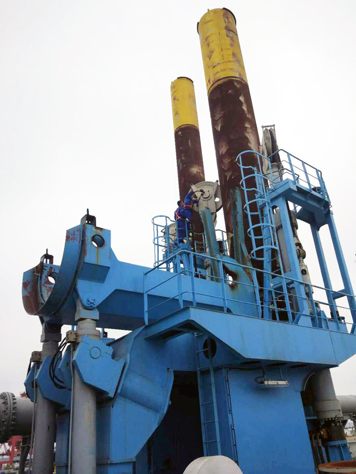 三是整套系統(tǒng)安裝精度高,大到十多層樓房高的巨型鋼樁,小到手指粗細(xì)的螺栓螺母,數(shù)以千計(jì)的各式零部件組裝過(guò)程采用精密測(cè)量器具核準(zhǔn)誤差,裝配過(guò)程借用工藝裝備,讓這個(gè)龐然大物從上到下從內(nèi)到外有了毫米級(jí)的整體安裝精度,保證鋼樁定位系統(tǒng)在各種復(fù)雜挖泥工況下長(zhǎng)期可靠運(yùn)行。