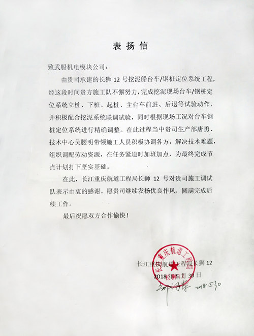 長(zhǎng)江重慶航道工程局致信贊譽(yù)鋼樁定位系統(tǒng)項(xiàng)目團(tuán)隊(duì)