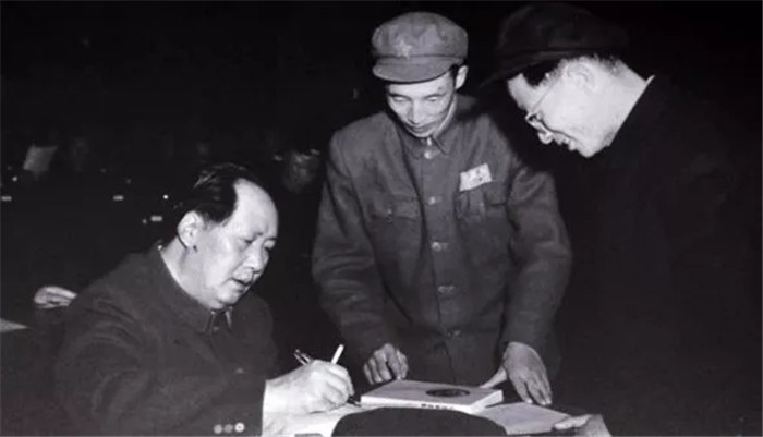 ▲1951年全國政協(xié)會(huì)議上毛澤東為王莘簽名(右一為王莘)