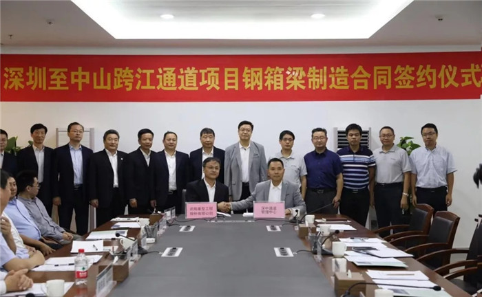 10月29日下午,廣東省深圳至中山跨江通道項(xiàng)目鋼箱梁制造G03標(biāo)段簽約儀式在中山舉行,武船重型工程股份有限公司(簡(jiǎn)稱武船重工股份)總經(jīng)理吳躍波代表公司與廣東省公路建設(shè)有限公司黨委書記、董事長(zhǎng)王康臣在合同文本上簽字,武船集團(tuán)黨委書記、董事長(zhǎng)陳?劍?黨委委員、副總經(jīng)理田軍,武船重工股份總工程師阮家順,常務(wù)副總經(jīng)理李立明出席簽約儀式。