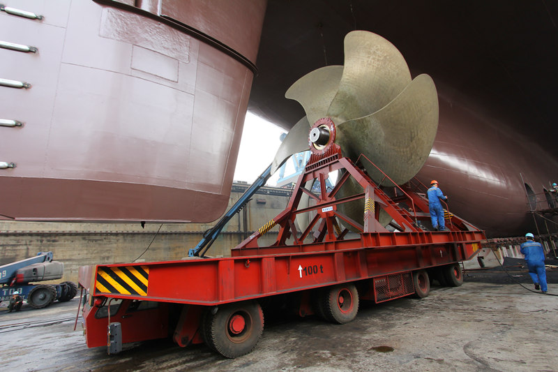 “臺車法”更換球鼻艏和推進器為世界首創(chuàng),大大降低工期和成本,提高了質量和效率。