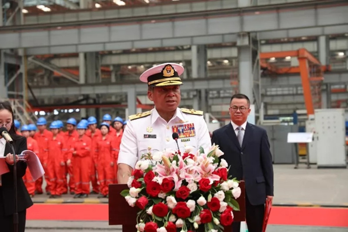 中船重工副總經(jīng)理何紀武、馬來西亞皇家海軍司令卡瑪魯扎曼上將赴開工現(xiàn)場并致辭??ì旚斣?,何紀武,莫實德船廠總裁拉姆利,國防科工局軍貿(mào)與外事司副巡視員馬衛(wèi)華,中船重工總經(jīng)理助理、中國船貿(mào)黨委書記、董事長徐子秋,武船集團黨委書記、董事長楊志鋼共同觸摸水晶球,啟動切割指令。